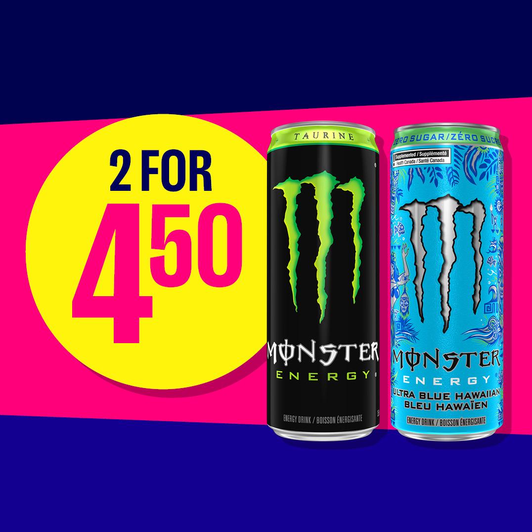 Deal runs from January 14, 2026, 12:00:00 am to March 31, 2026, 11:59:59 pm. Journie members may buy 2 Monster Energy Drinks (355ml) for $4.50. Non-member retail price: $3.89-$3.99 per unit. Deposit, levies & taxes where applicable. Limit of 6 products per transaction, per person, per day. For participating locations, visit the Map in your Journie Rewards app or the Store Locator on journie.ca to find a store where you can earn Journie Rewards. Not applicable at independent dealer locations.