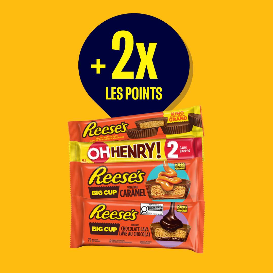 Obtenez 2 barres de chocolat Hershey de format King pour seulement 5 $ et gagnez le double de points ! Faites-vous plaisir avec vos favoris tout en accumulant des récompenses.