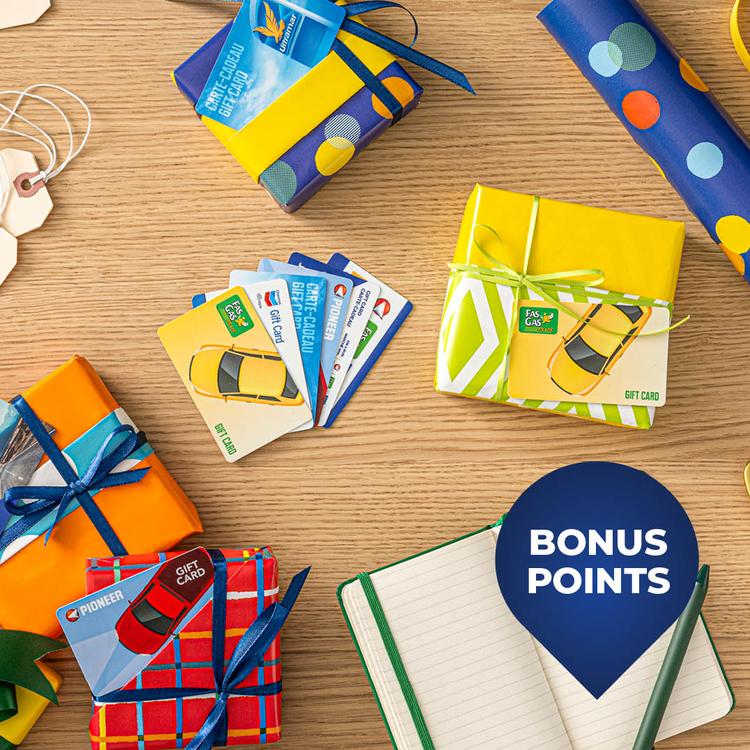 Get 1 point per $1 spent on every gas gift card purchase of $10 or more. Get 2 points per $1 spent on every gas gift card purchase of $10 or more when you pay with a linked CIBC card.