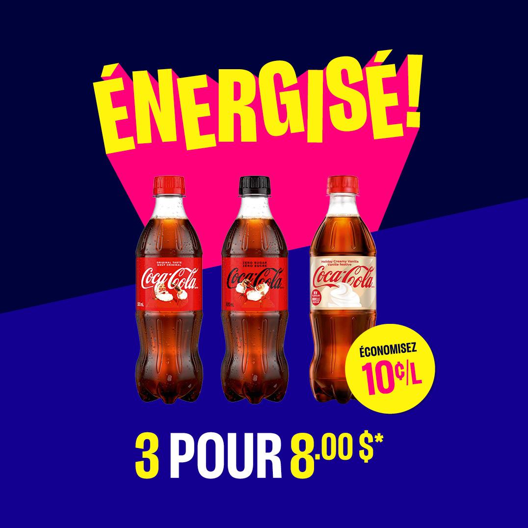 Rendez chaque gorgée profitable! Achetez 3 boissons gazeuses Coca-Cola (500 mL) pour 8 $, et économisez 10 ¢ par litre sur votre prochain achat d’essence, jusqu’à concurrence de 100 L.