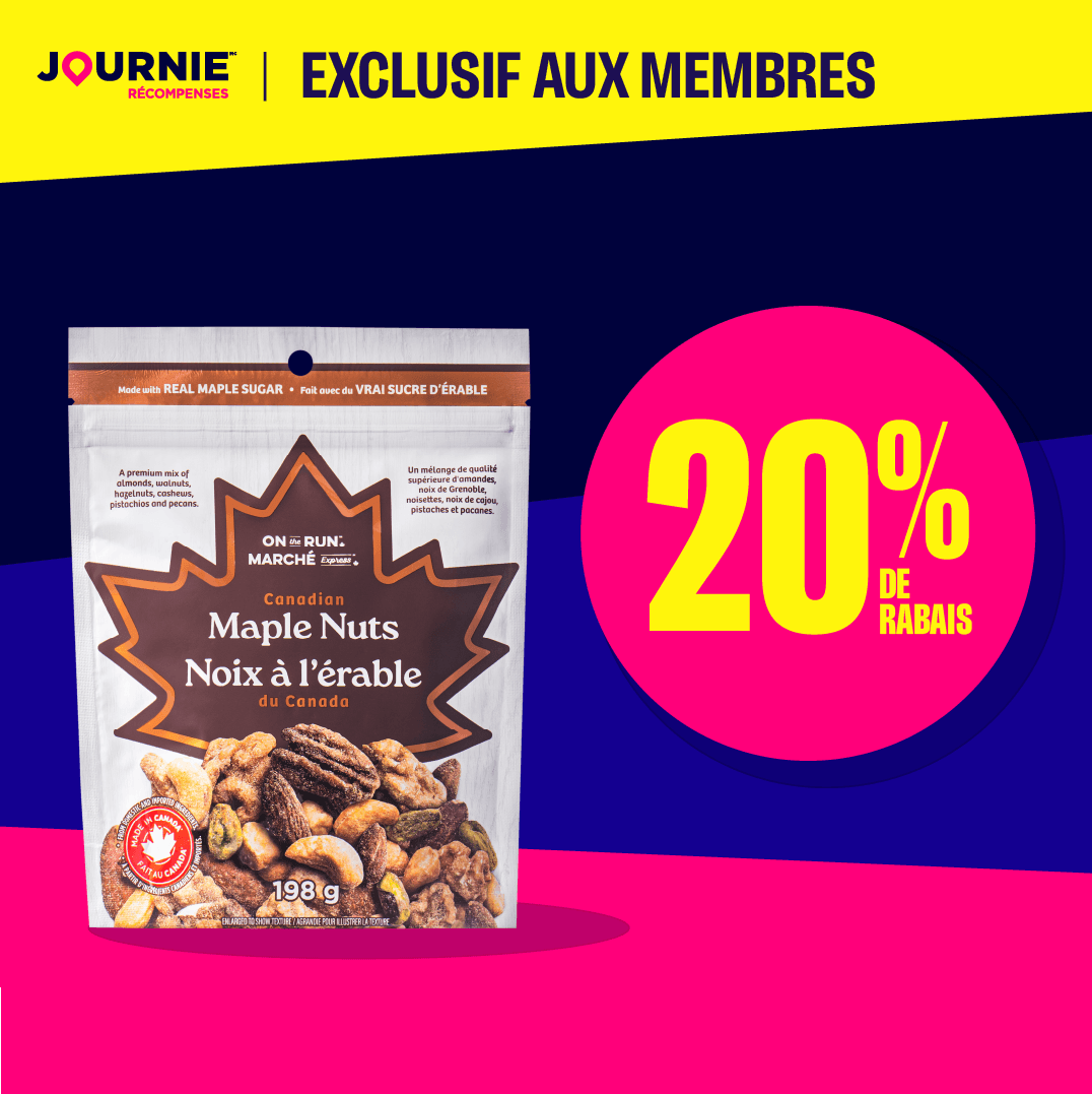 * L’offre est valable du 15 décembre 2025 à 12 h 00 au 21 décembre 2025 à 23 h 59. Économisez 20 % sur les noix à l’érable du Canada Marché Express de 198 g. Pour connaître les stations-service participantes et trouver un magasin où vous pouvez gagner des Récompenses Journie, consultez la page « Emplacements » sur votre appli Journie ou sur journie.ca. Offre non valide chez les concessionnaires indépendants.