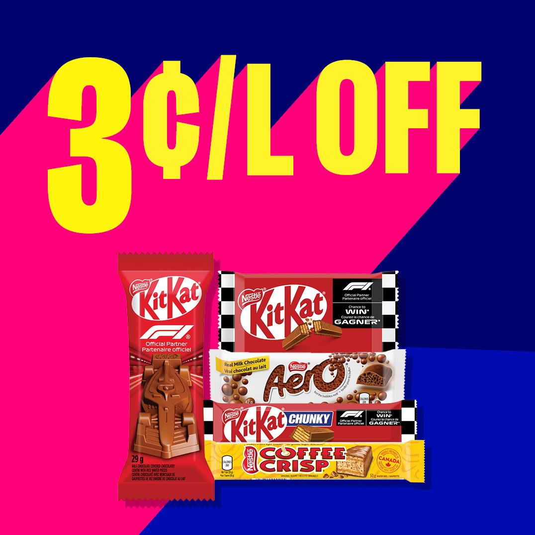 Buy any 3 Nestlé chocolate bars for just $5 and save 3¢ per litre on fuel. Stock up, save at the pump, and enjoy a super sweet win.