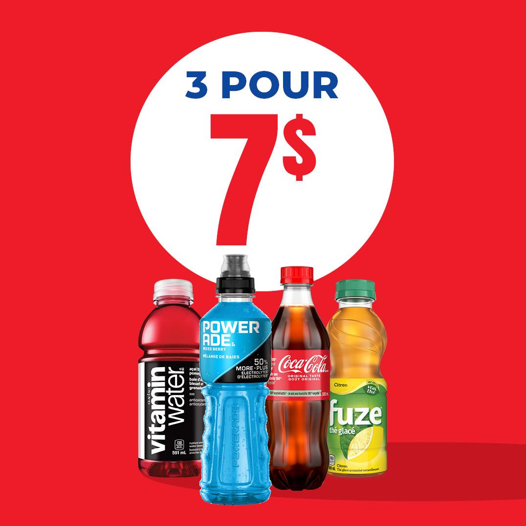 Pourquoi se limiter quand on peut varier? Achetez 3 boissons Coca‑Cola (500 ml), Powerade (710 ml), Fuze (500 ml) ou Vitaminwater (591 ml) pour seulement 7 $. Plus de choix, plus de fraîcheur, plus d’économies.