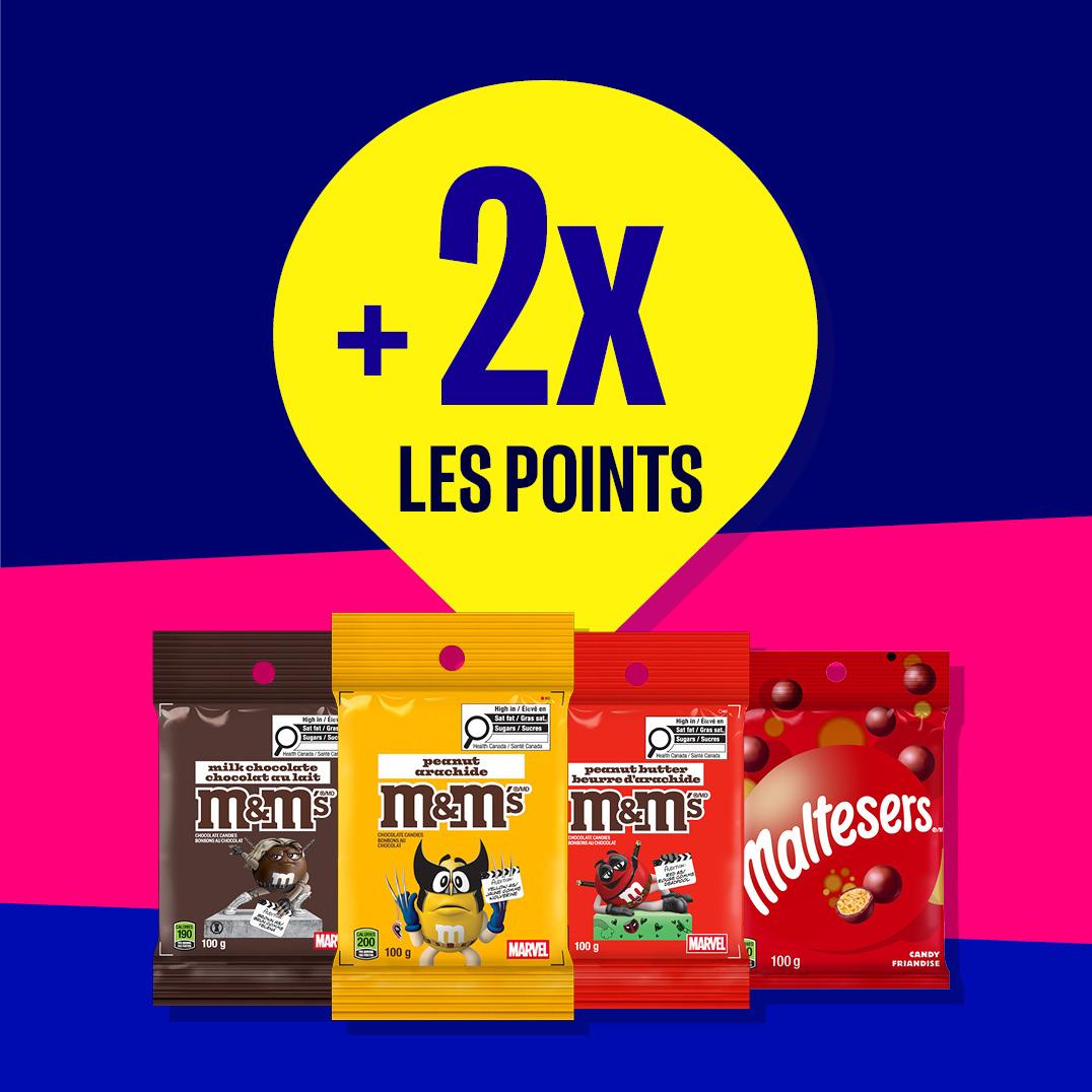 L’offre est en vigueur du 1 avril 2026 à 0 h 00 min 00 s au 9 juin 2026 à 23 h 59 min 59 s. Vous profiterez du multiplicateur de points décrit ci-dessous à l’achat de 2 M&M’s, Maltesers, ou Mars (95-109g) pour 7 $. Vous obtiendrez 4 points Journie par dollar dépensé sur des produits admissibles achetés dans les points de vente participants. Des taxes, redevances et consignes s’appliquent, s’il y a lieu. Le multiplicateur de points sera appliqué seulement à la valeur des produits admissibles, et non à la valeur totale de l’achat. Limite quotidienne de 6 produits par transaction, par personne. Pour consulter la liste des emplacements participantes, visitez le Plan sur l’appli Récompenses Journie ou la page Emplacements à journie.ca pour trouver un emplacement où vous pouvez accumuler des récompenses Journie. Non applicable chez les détaillants indépendants.