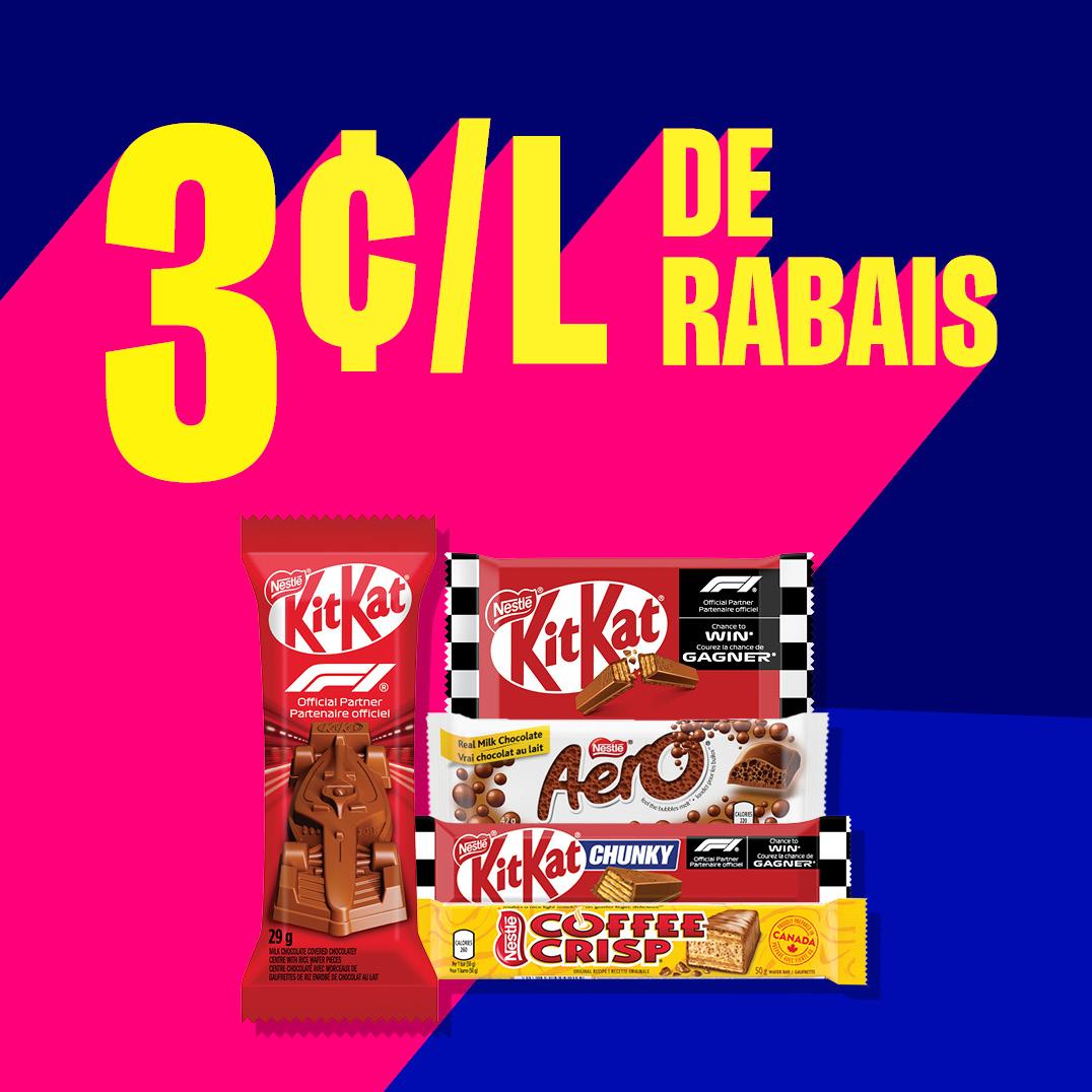 Achetez 3 barres de chocolat Nestlé pour seulement 5 $ et obtenez 3 ¢/L de rabais sur l’essence. Des économies et du chocolat, on aime ça !