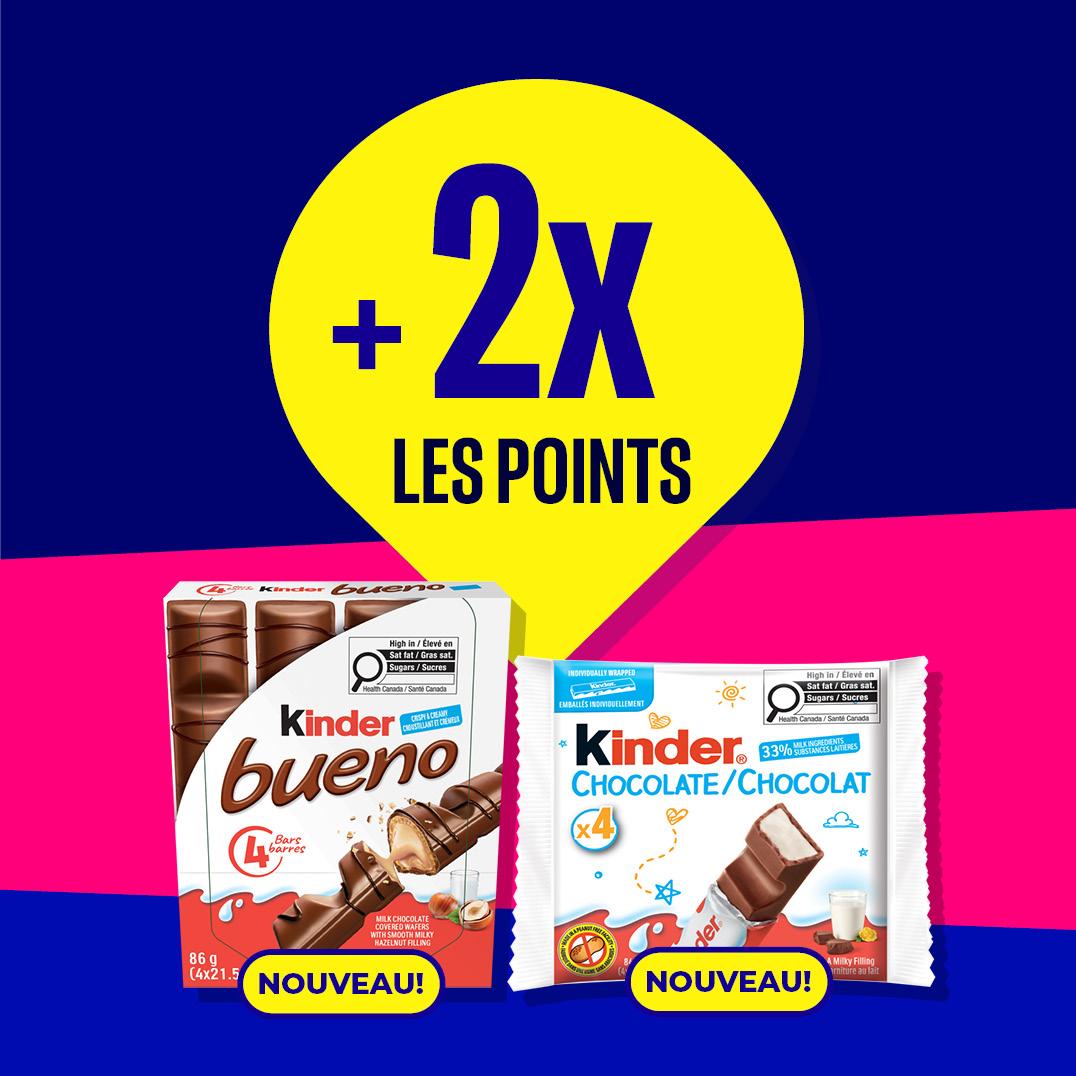 Exclusif aux membres Journie! Achetez 2 barres Kinder King pour 6 $ et obtenez 2 fois plus de points. Voici une pause chocolatée qui permet d’accumuler des points en prime!