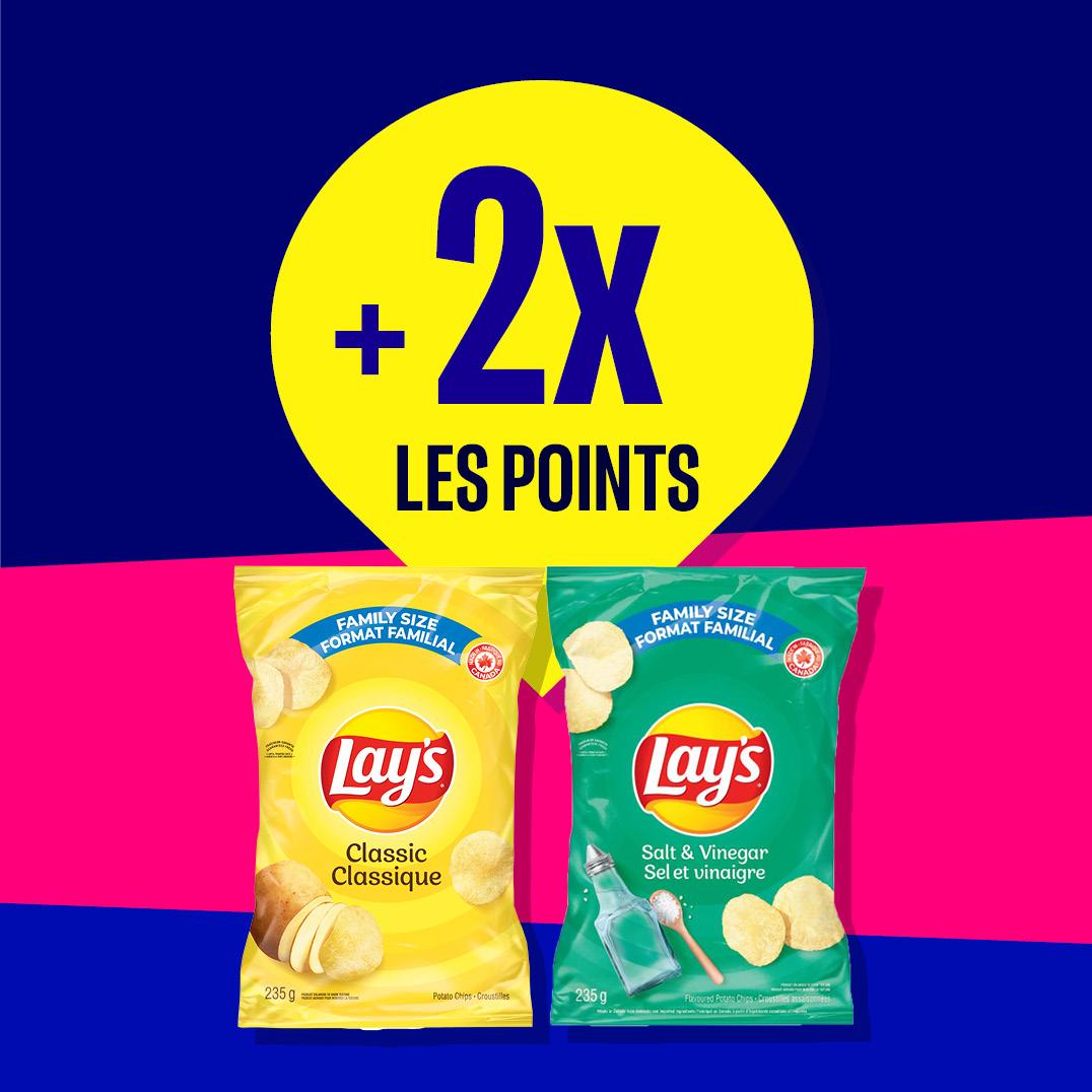 Plus de saveurs et de récompenses. Achetez 2 sacs de chips Lay’s (177-235g) pour 8 $ et obtenez 2 fois plus de points. Exclusif aux membres Journie.